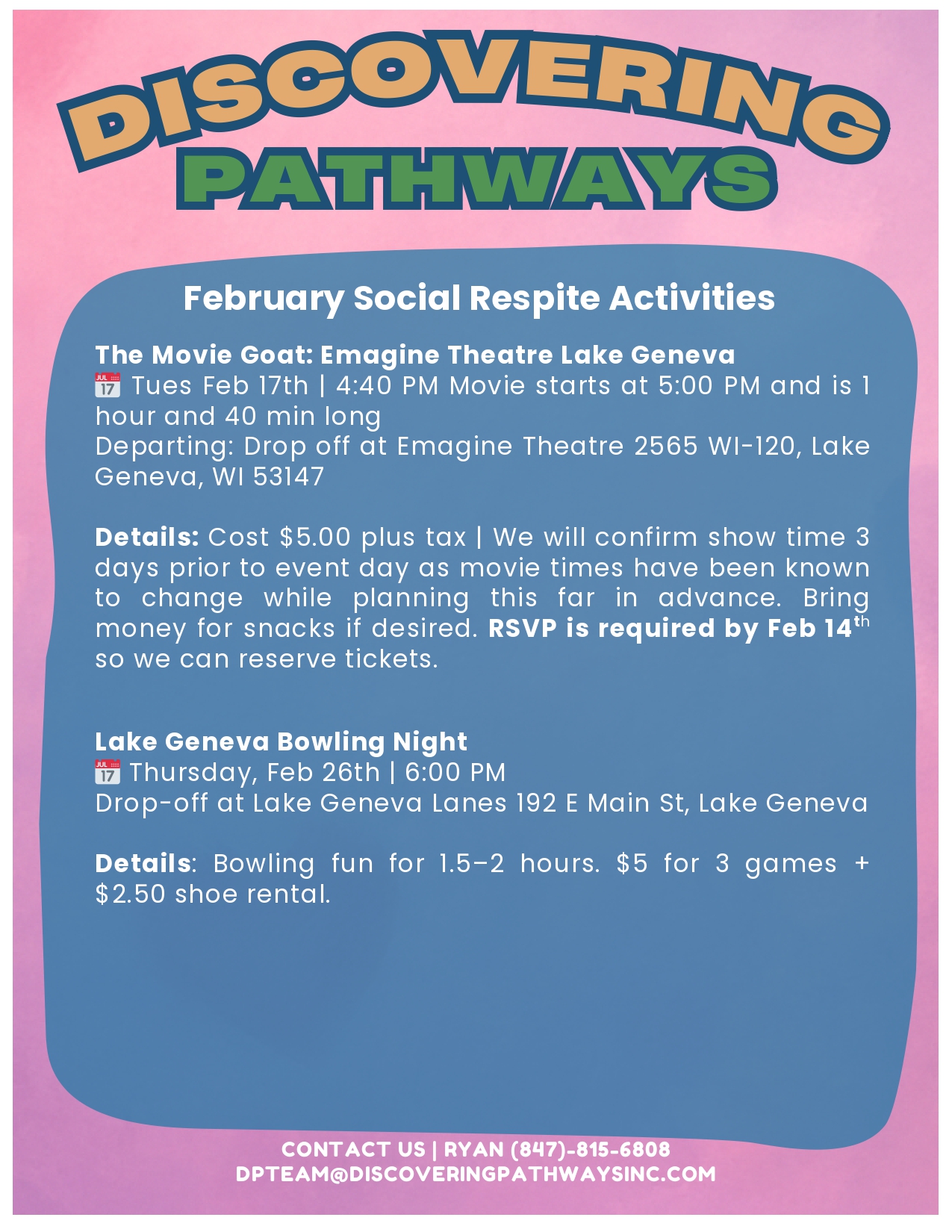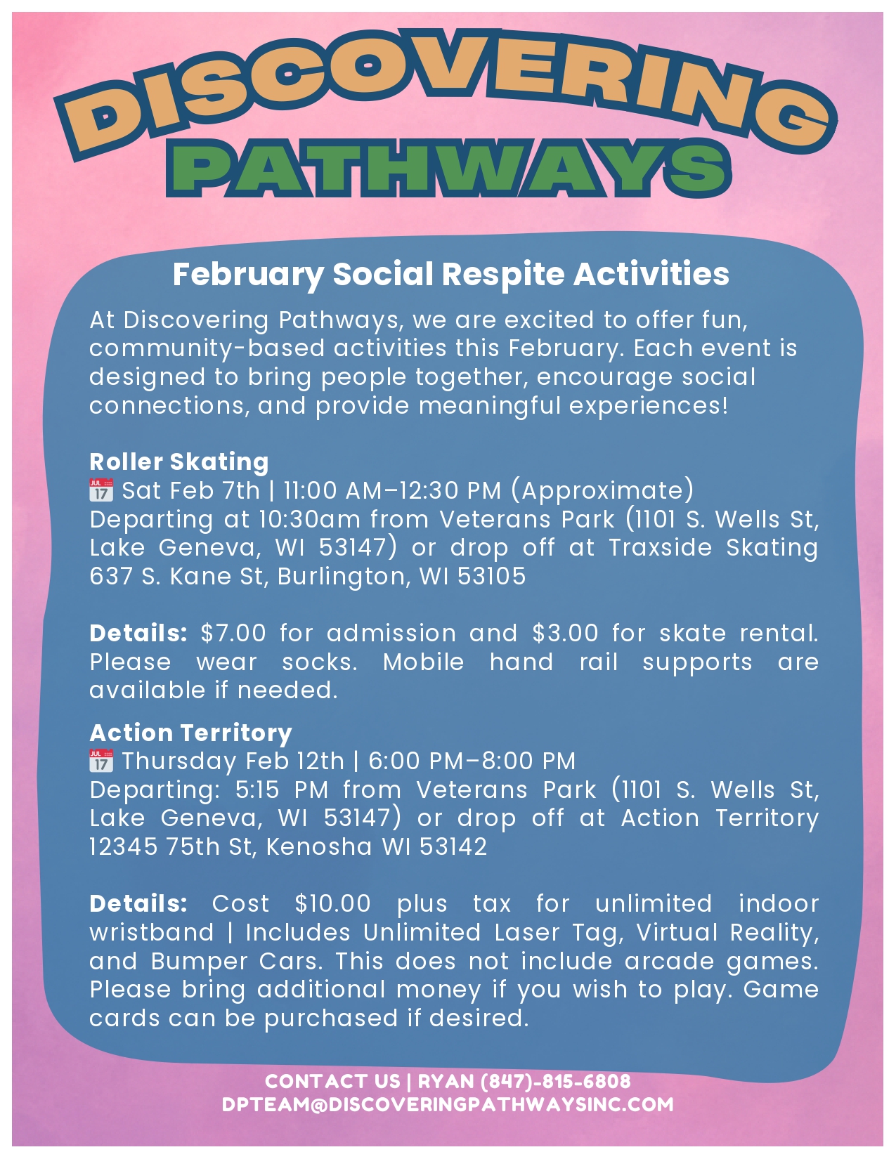Discovering Pathways empowers adults with disabilities by offering person-centered community-based day service and respite care programs that create meaningful opportunities for personal growth and enhanced quality of life. We believe in fostering authentic connections by carefully matching Direct Support Professionals (DSPs) with individuals based on shared interests, allowing for natural interactions and the building of trust. This personalized approach helps individuals feel confident and comfortable while learning essential community living skills, guiding them toward greater independence.